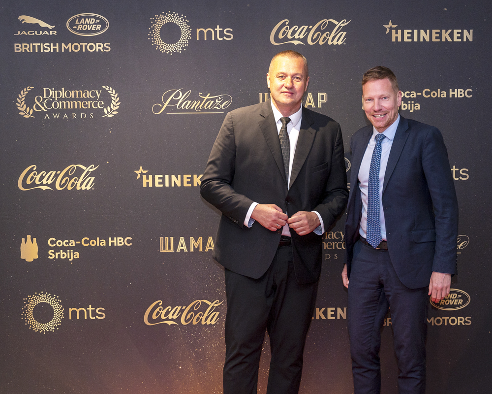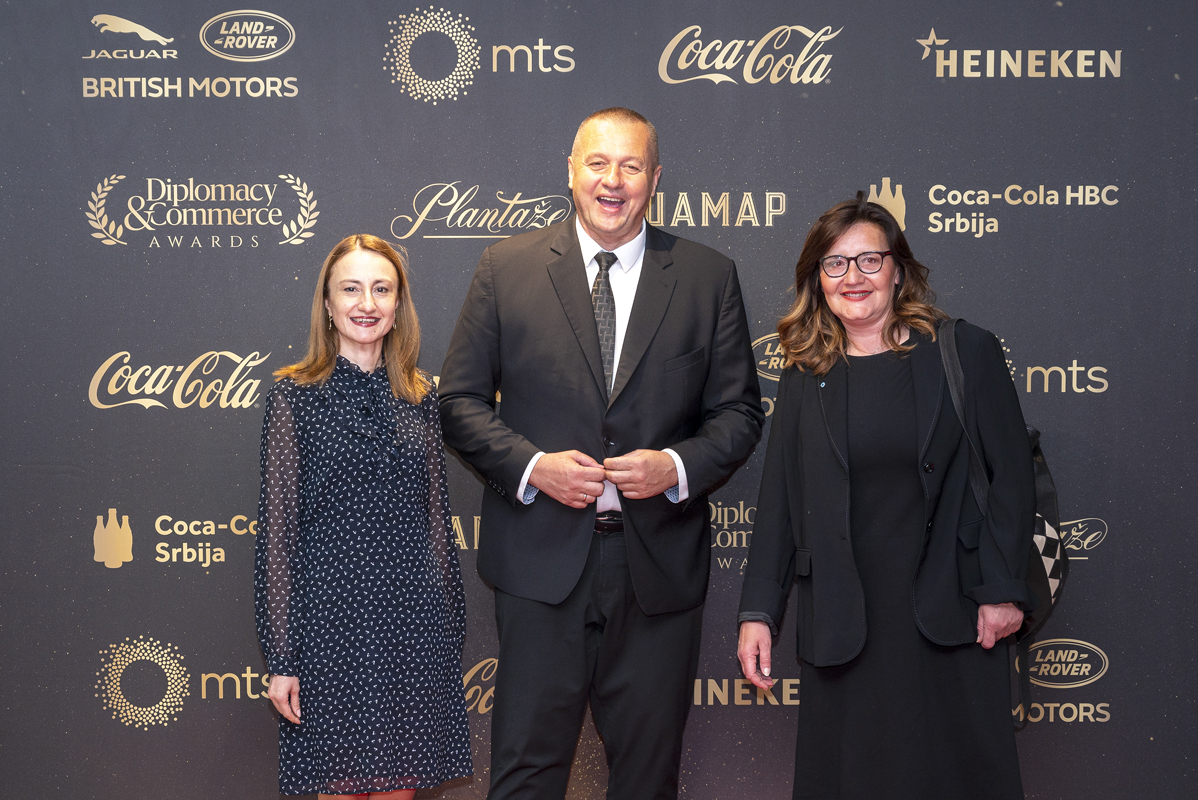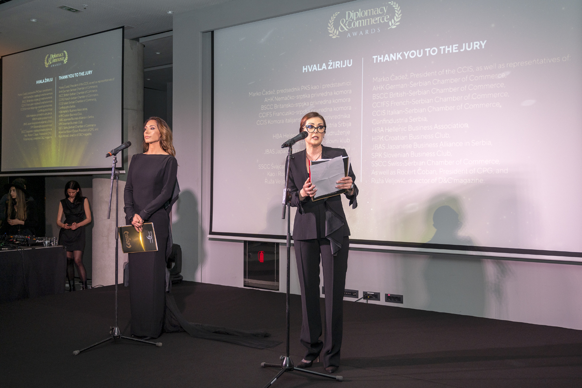 DIPLOMACY&COMMERCE AWARDS were presented to individuals, companies and organizations that excelled in humanitarian work, CSR, sustainable business and green projects, digitalization and business innovation, development of arts and culture, as well as improving bilateral cooperation, economic environment, business conditions. and society as a whole. Diplomacy&Commerce awards were given out in a total of twelve categories, of which awards were given by the jury to companies, organizations and individuals in eight categories. Four special awards were given by the magazine’s editorial staff. The members of the jury were the following – Marko Čadež, president of the Chamber of Commerce and Industry of Serbia (CCIS) and jury chairman, AHK Serbia – Gert Rabbow, BSCC – Jadranka Dervišević Kitarić, CCIFS – Sanja Ivanić, CCIS – Mirjana Kojić, Confindustria – Irena Brajović, HBA – Fanina Kovačević, CBC – Marija Radulović, JBAS – Oliver Lepori, SBC – Danijela Fišakov, SSCC – Ana Grujović, as well as representatives of D&C magazine – Robert Čoban, president of CPG, and Ruža Veljović, director of D&C magazine.