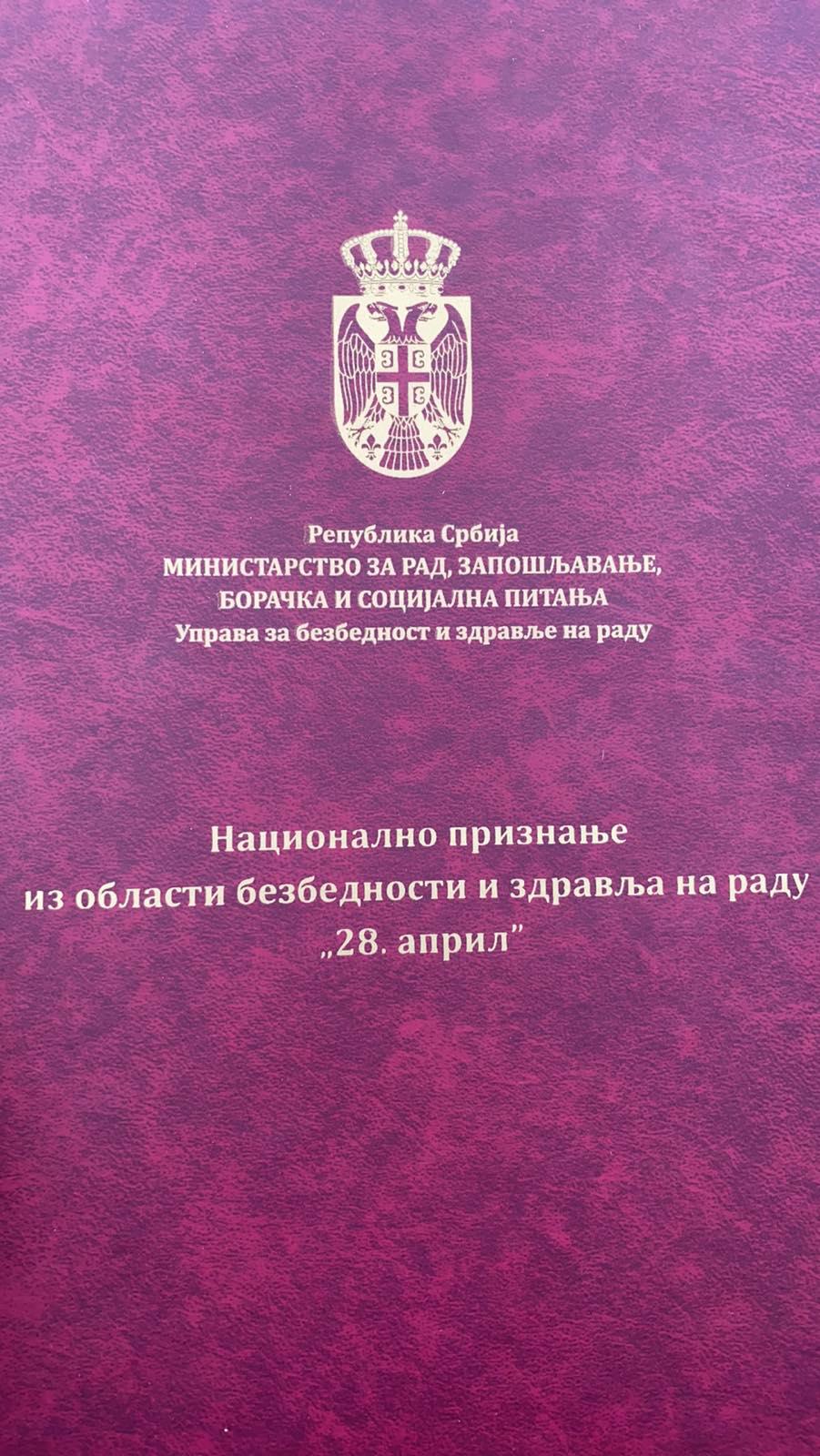 Annual national awards in the area of occupational safety and health have been granted since 2010 to mark the World Day for Safety and Health at Work and the Day for Safety and Health at Work in the Republic of Serbia – April 28.