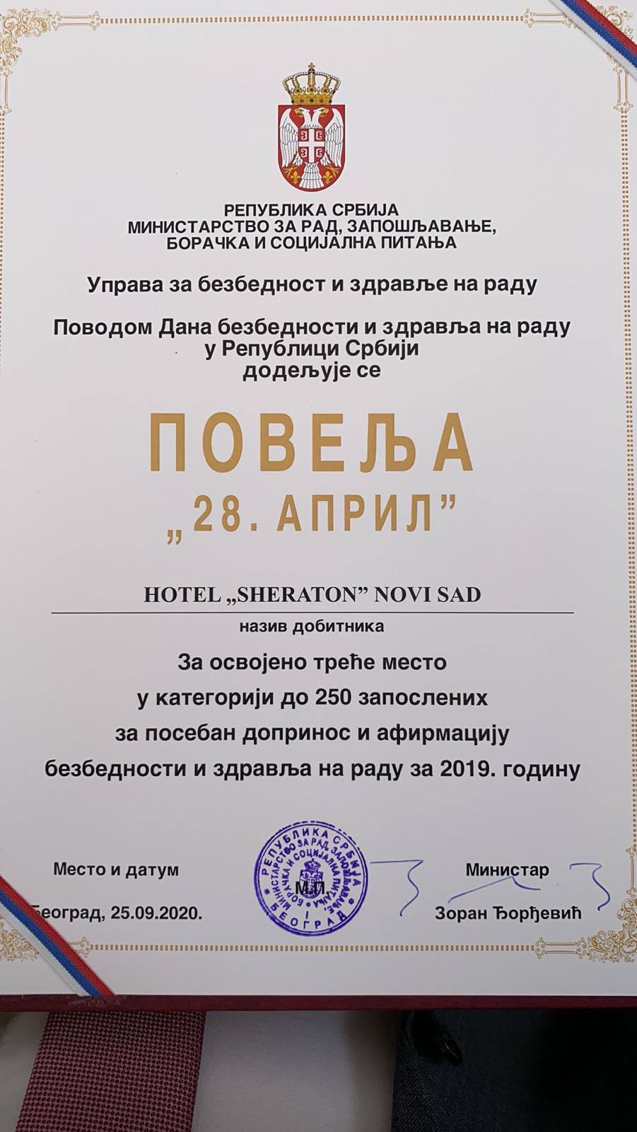 The Commission for granting national awards in the area of occupational safety and health has rewarded the 3rd place award to the Sheraton Novi Sad Hotel for exceptional achievements in occupational safety and health for 2019. The “April 28th” Plaque Award in the category of companies with up to 250 employees was granted to Novak Bojanić, Director of the Sheraton Novi Sad.